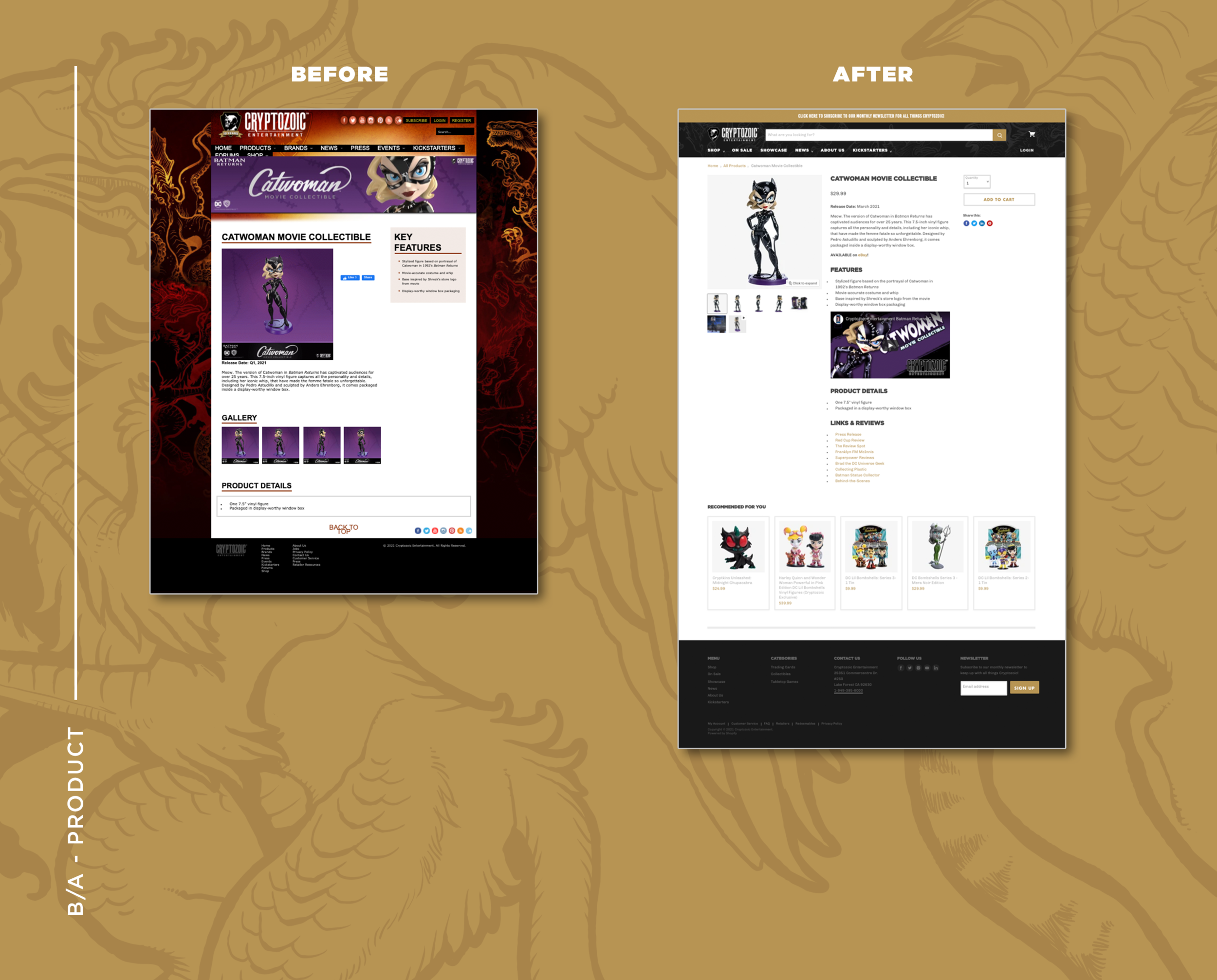 A complete overhaul of the previous Cryptozoic Entertainment website and Volusion based web store. The main goals of the redesign were to combine the two websites’ various features while also modernizing it entirely. The new Shopify-based website is now an informational hub for all things Cryptozoic, while also functioning as a direct sales E-Store: an extremely important pivot for the company during the height of the COVID pandemic in 2020.